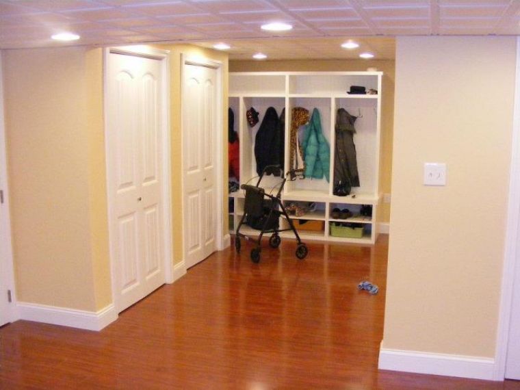An unfinished basement was converted to a spacious family room, complete with built in storage units.