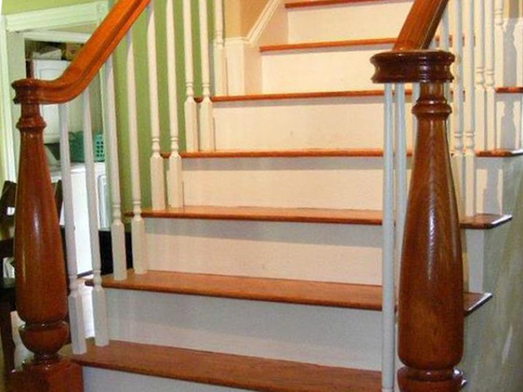 An outdated and unsafe staircase was remodeled to feature oak treads and bright white railings, creating an entryway that shines.